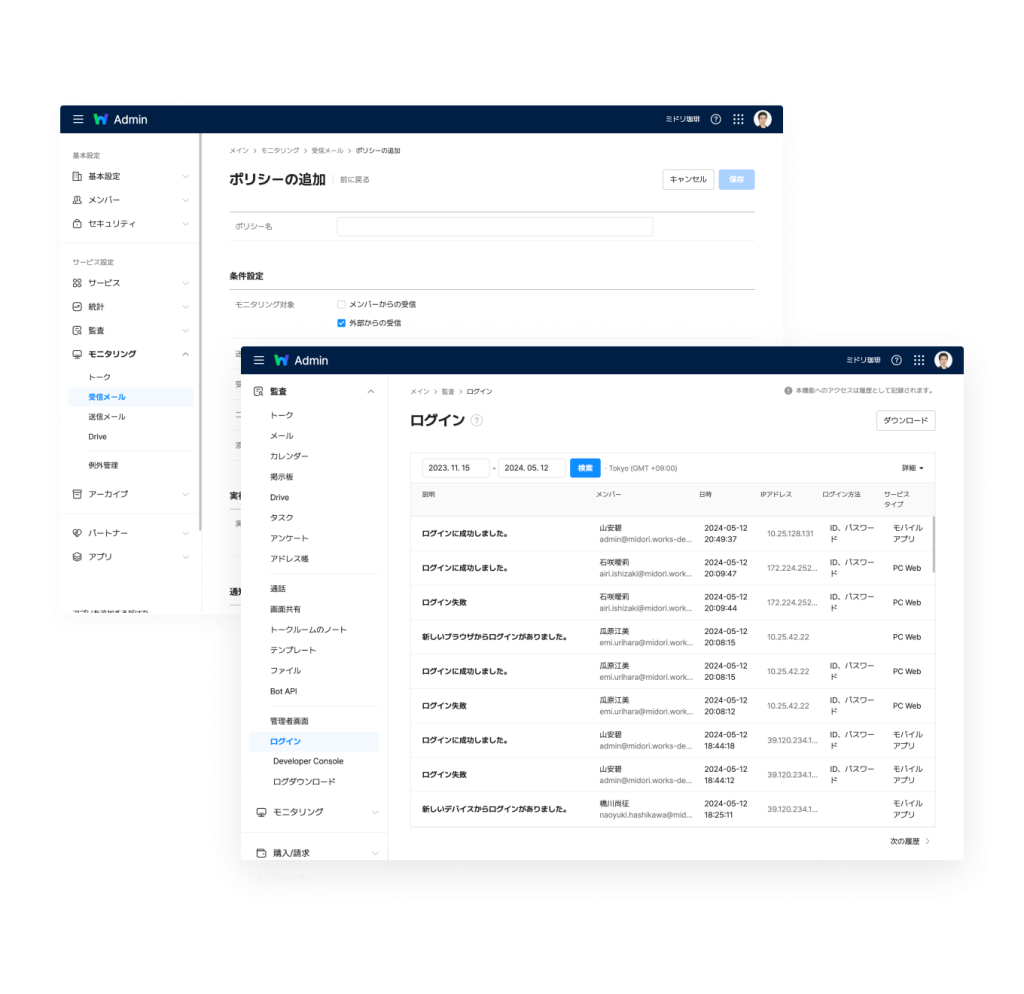 モニタリングし、日時、作業内容、IPアドレス、送受信者等の条件で検索してログを確認できます。