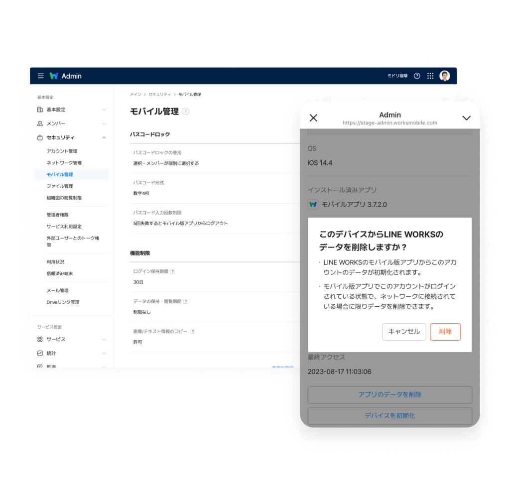 スマートフォンの盗難・紛失時の遠隔データ削除。LINE WORKSから端末へのファイル保存制限、外部MDMとの連携によって特定端末からのみのログイン許可など、スマートフォンからのサービス利用のためにも充実のセキュリティ機能を備えています。