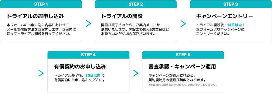 - トライアル環境開設後14日以内にキャンペーンエントリーフォームからエントリー