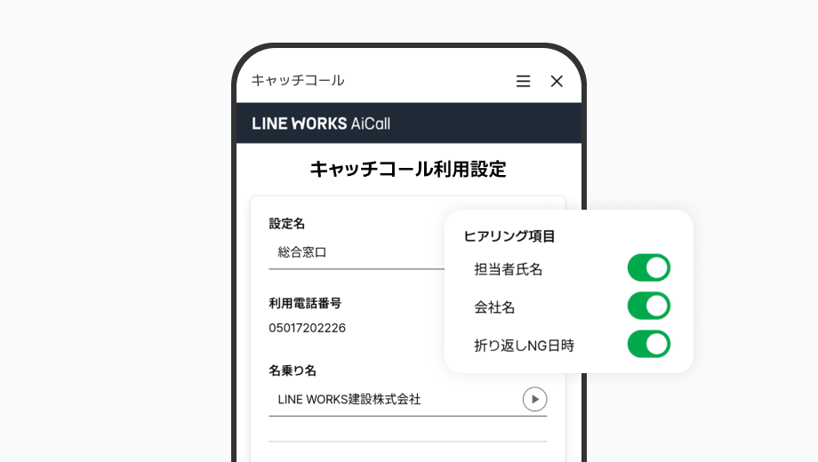 ・LINE WORKSキャッチコールのデモ体験を利用した際の音声データ及びテキストデータ、利用端末の電話番号(発信電話番号)は、LINE WORKS AI製品プライバシーポリシーに従って取扱います。