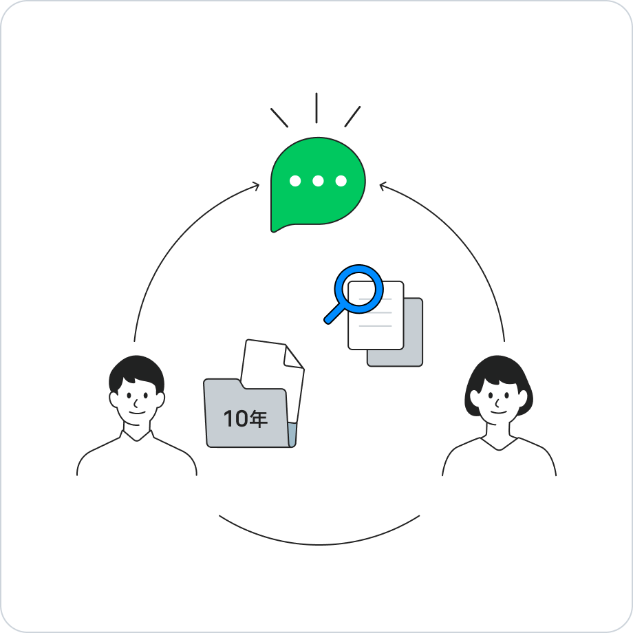 トークの送受信データを最長10年間保存できます。メンバーがトークルーム上でデータを削除しても設定された保存期間に該当するデータ(添付ファイルを含む)が保存され、管理者画面上で確認することができます。