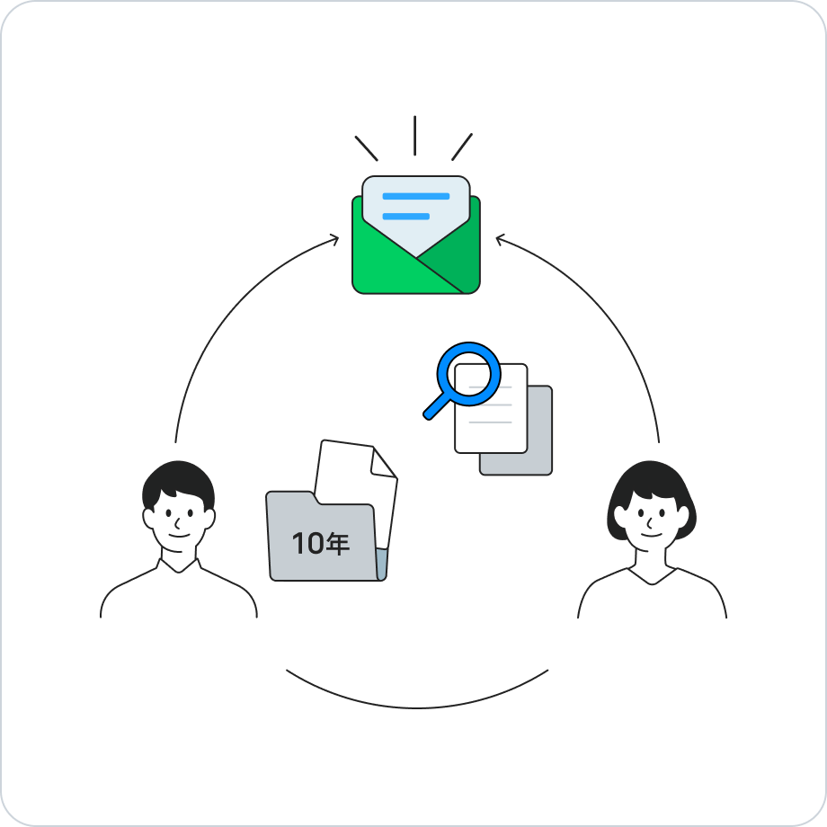 メールの送受信データを最長10年間保存できます。メンバーがメール画面上でデータを削除しても設定された保存期間に該当するデータ(添付ファイルを含む)が保存され、管理者画面上で確認することができます。