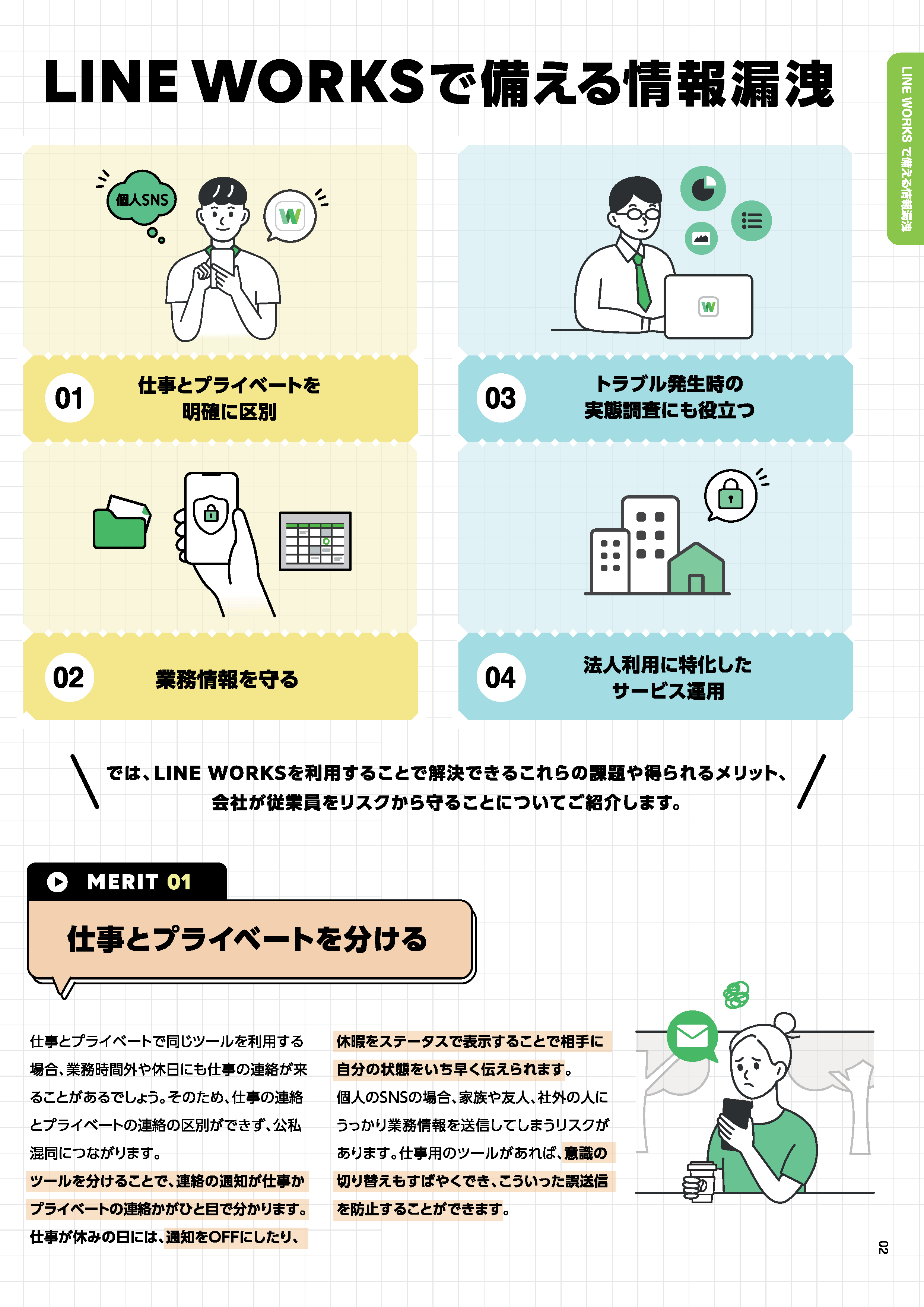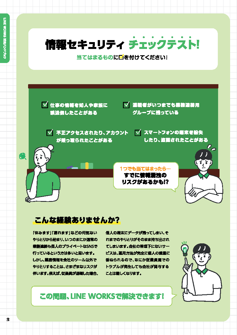 - 本書では、LINE WORKSを利用することで、解決できる情報漏洩の課題や、得られるメリットについてご紹介します。