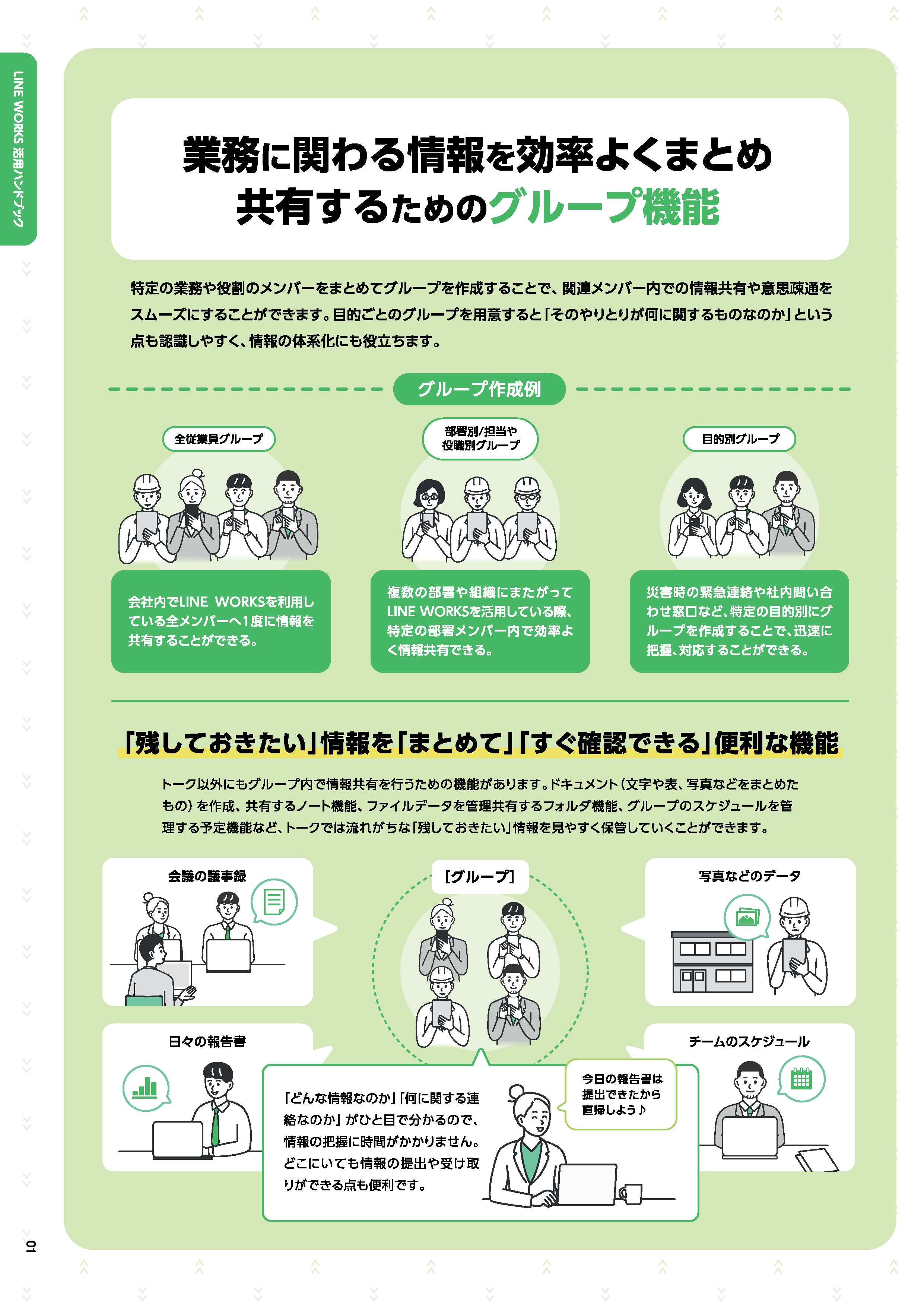 - LINE WORKSのトークルーム機能は、関連メンバー内で情報共有や意思疎通をスムーズに行うことができます。 トーク以外にもファイルデータを保存したり、予定管理もできるグループ機能についてご紹介します。