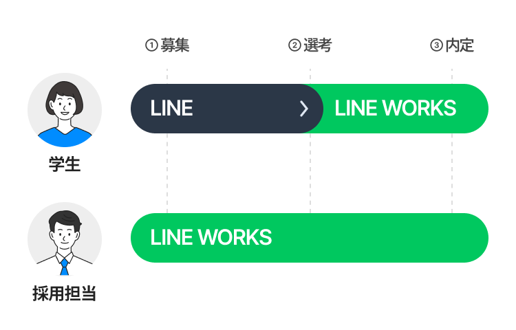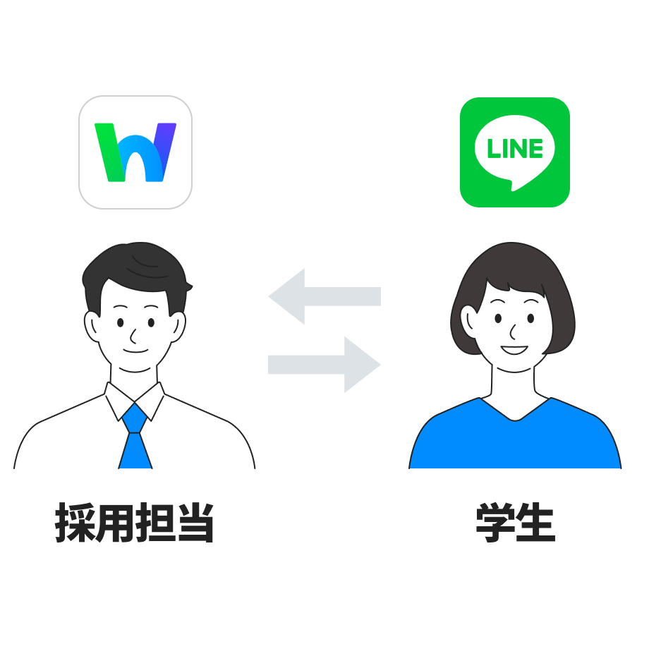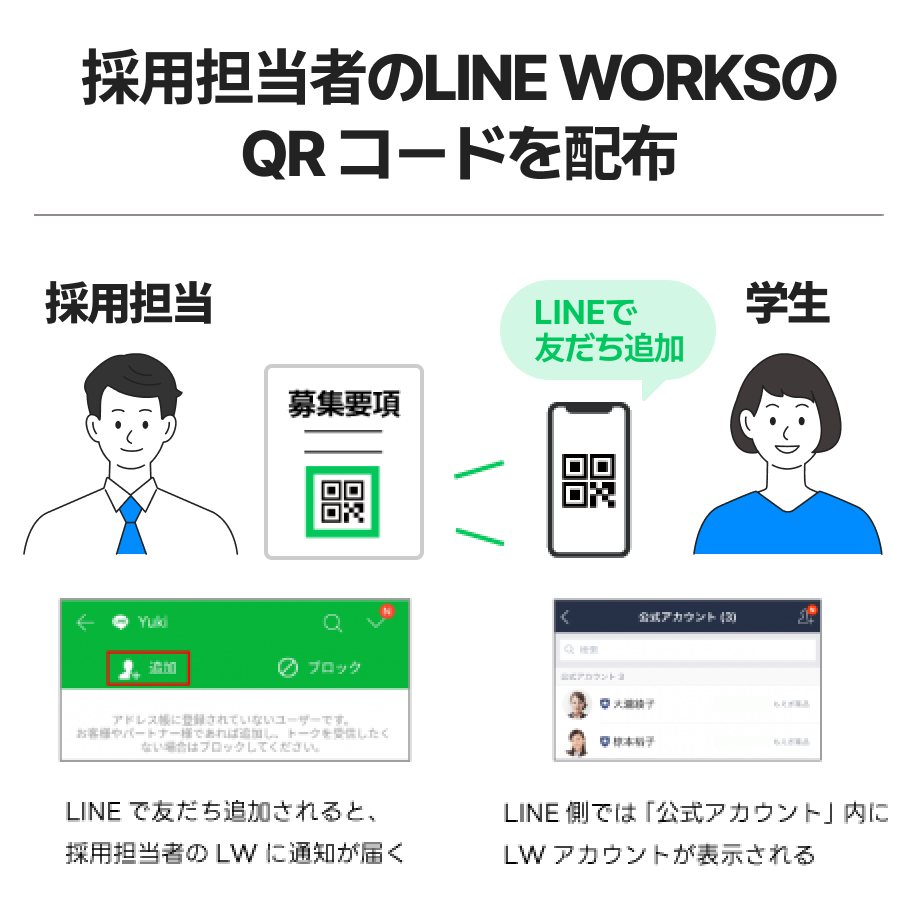 まずは、採用担当者のLINE WORKSを、応募学生のLINEの友だちに追加してもらいましょう。