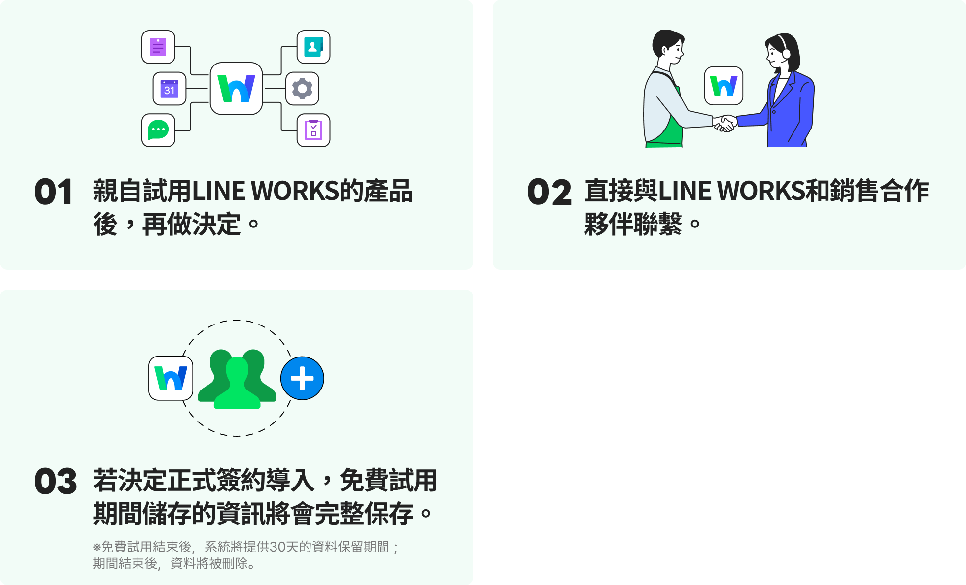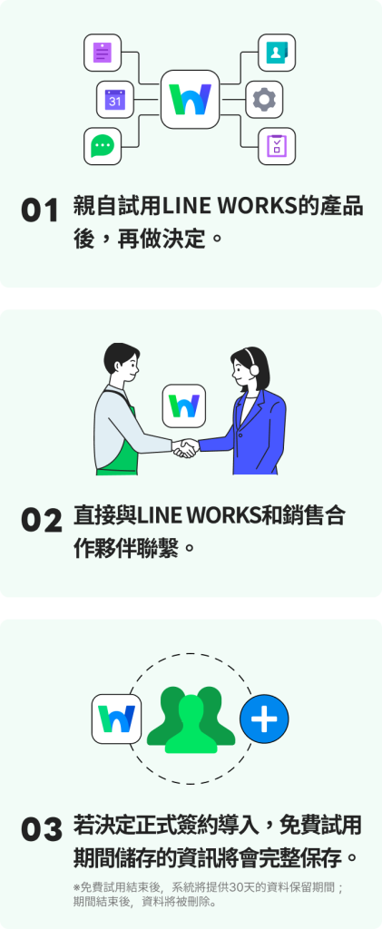 免費提供LINE WORKS產品30天試用的服務。