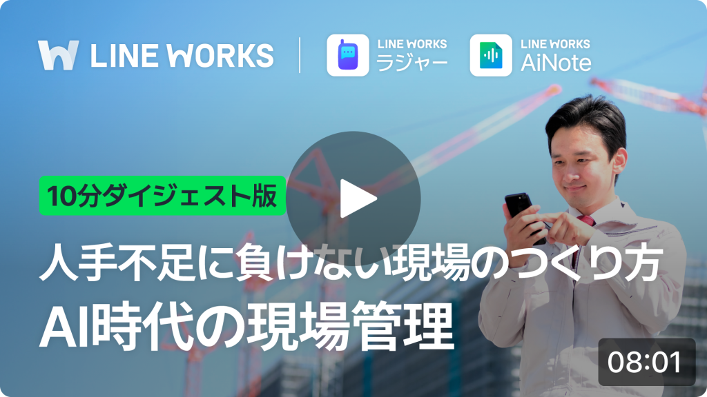スマホに「 LINE WORKSラジャー」のアプリをインストールすれば、トランシーバーとして使うことができます。インターネットがつながれば会話ができるので距離の制約を受けません。発言内容はテキスト化され、後から確認できるので、「言った言わない問題」を解消し、作業の手戻りも削減できます。