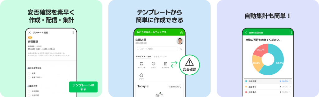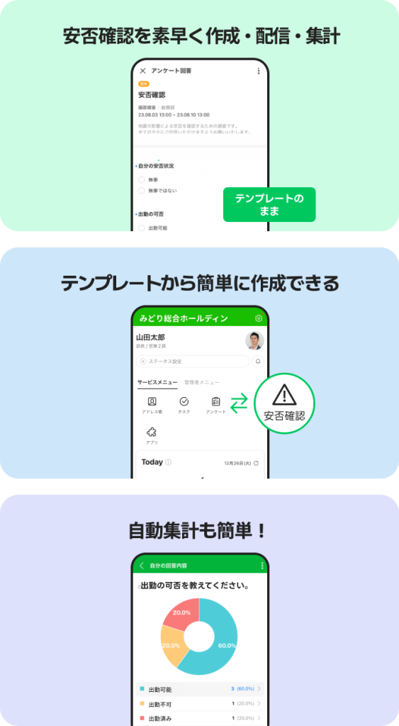 そんな場合は「アンケート」がオススメ。安否確認のアンケートの「テンプレート」が用意されているので、作成も簡単です。回答結果は自動集計され、グラフで確認できます。