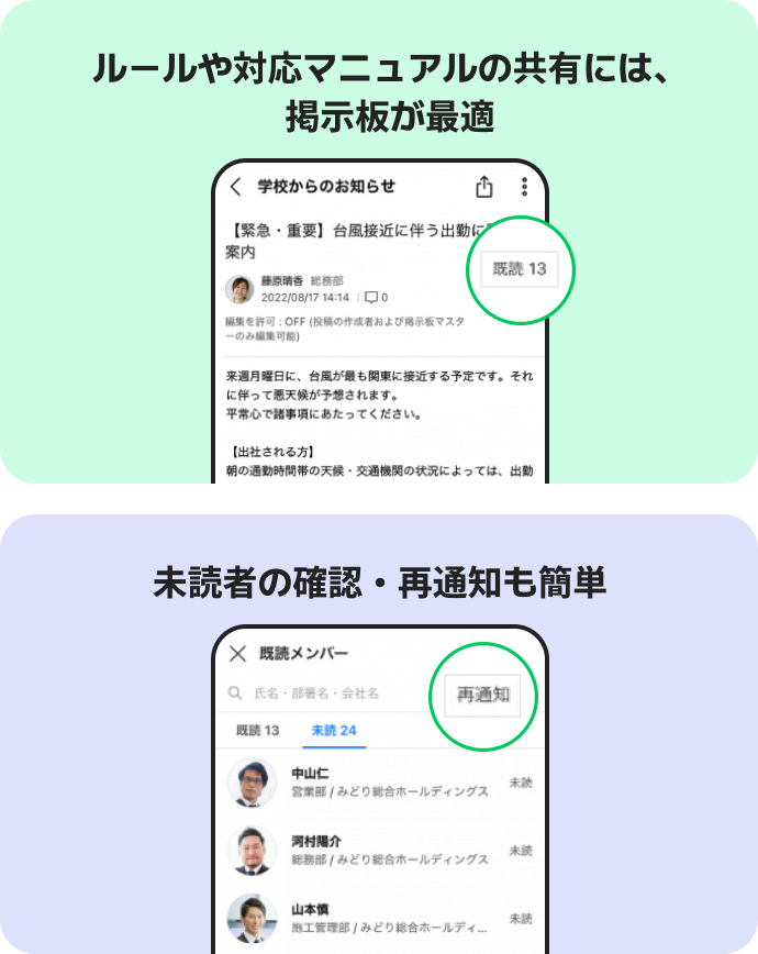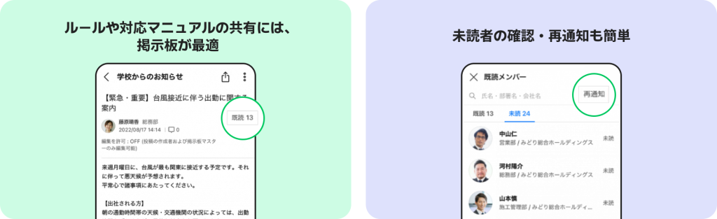 トークのように情報が流れていかずに、「必読設定」や「未読者への再通知」も行えるため、見逃しを防ぐことができます。緊急時の注意事項やマニュアルを常設しておけば、必要な情報にすぐにたどり着けます。